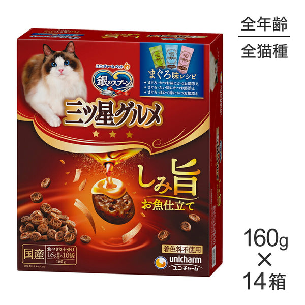 【160g×14箱】ユニ・チャーム 銀のスプーン 三ツ星グルメ しみ旨お魚仕立て 3種のアソート 全年齢用 まぐろ味レシピ (猫・キャット)