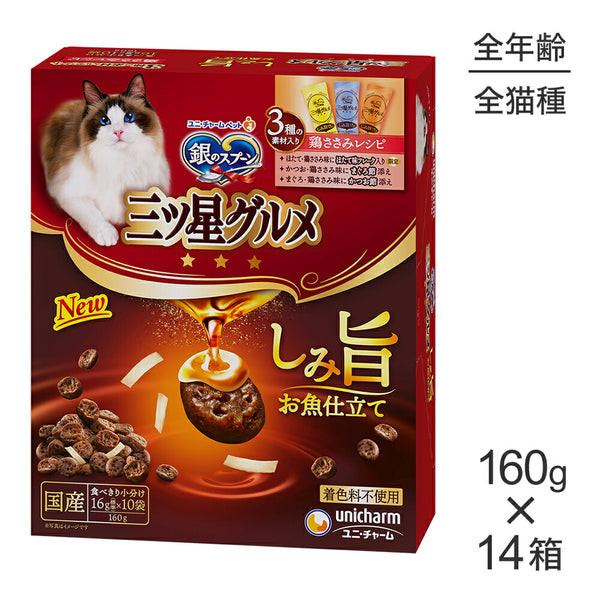 【160g×14箱】ユニ・チャーム 銀のスプーン 三ツ星グルメ しみ旨お魚仕立て 3種の素材入りアソート 全年齢用 鶏ささみレシピ (猫・キャット)