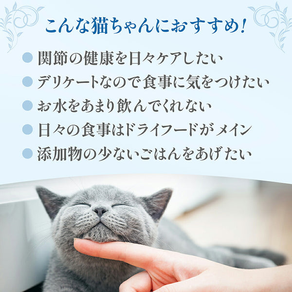 水、チキン、増粘安定剤(タピオカ澱粉、グァーガム)、小麦若葉、ひまわり油、香料、まぐろ油、ミネラル類(Ca、P、K、クロライド、Na、Fe、Zn、Mn、Cu、Se、I)、タウリン、ビタミン類(コリン、E、B1、A、ナイアシン、B6、パントテン酸Ca、B2、葉酸、B12、D3、ビオチン)、コンドロイチン硫酸、グルコサミン硫酸、L-カルニチンL-酒石酸塩