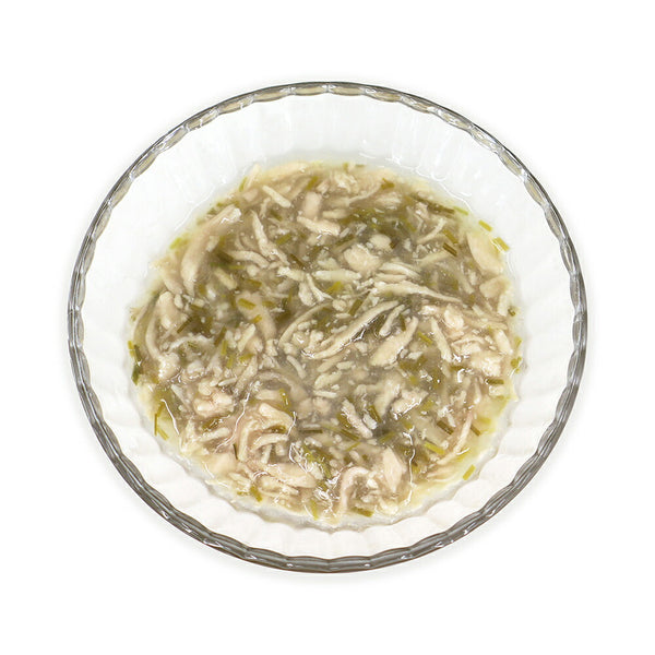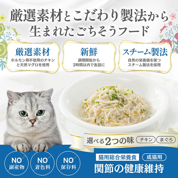 水、チキン、増粘安定剤(タピオカ澱粉、グァーガム)、小麦若葉、ひまわり油、香料、まぐろ油、ミネラル類(Ca、P、K、クロライド、Na、Fe、Zn、Mn、Cu、Se、I)、タウリン、ビタミン類(コリン、E、B1、A、ナイアシン、B6、パントテン酸Ca、B2、葉酸、B12、D3、ビオチン)、コンドロイチン硫酸、グルコサミン硫酸、L-カルニチンL-酒石酸塩