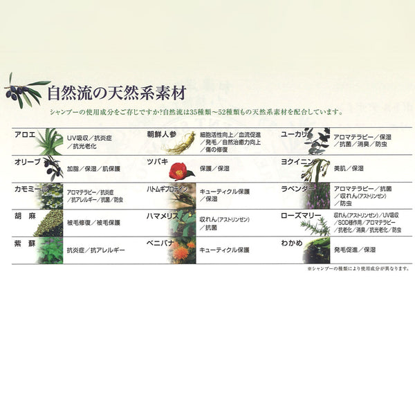 朝鮮人参、霊芝、紅花、椿、ザクロ、アケビ、ヨモギ、桃葉、枇杷・枇杷葉、緑茶、アロエ、ヘチマ、深海鮫スクワレン、真珠プロテイン、海洋深層水ミネラル、ハトムギプロテイン、ヒアルロン酸、コラーゲン、エラスチン、ウーロン茶、ハブ茶、ヨクイニン、米糠、オリーブ、ラベンダー、カモミール、ローマカミツレ、ユーカリ、コンブ、ヒジキ、ノリ、ワカメ、ゴボウ、ヤドリギ、紫根、メリッサ、オノニス、甘草、ビロードアオイ、クララ、アンズ、竹、ローズマリー、タチジャコウソウ、オドリコソウ、ハマメリス、大豆、小豆、舞茸、椎茸、柚子、紫蘇、桜、胡桃、胡麻、胡瓜、ミンクオイル、ノニ果汁、ライチ果汁、アミノ酸、ビタミンA、ビタミンD、ビタミンB群、ビタミンE、トコトリエノール、加脂保湿成分、脂肪酸系等毛質保護成分、アミノ酸系・ヤシ脂肪酸ベタイン系・ベニバナ脂肪酸系・タウリン系等の洗浄成分 など