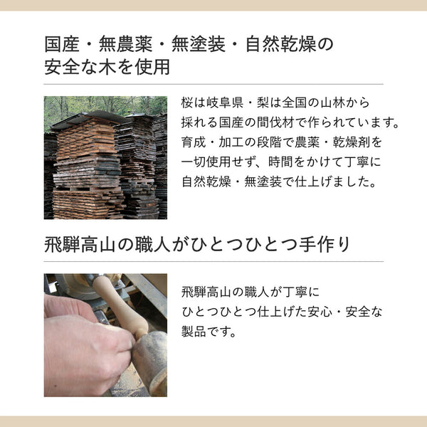 桜は岐阜県・梨は全国の山林から採れる国産の間伐材で作られています。育成・加工の段階で農薬・乾燥剤を一切使用せず、時間をかけて丁寧に自然乾燥・無塗装で仕上げました。