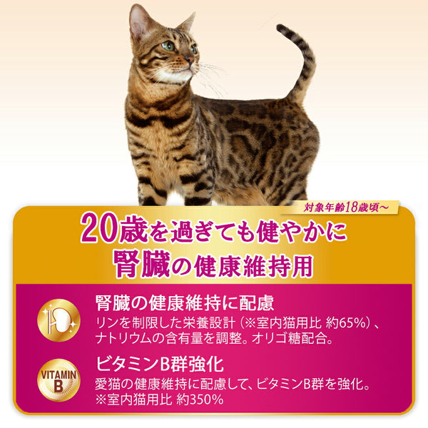 ●腎臓の健康維持に配慮して、リンを制限した栄養設計(*室内猫用比 約80%)、Ca/P比調整、適塩設計。オリゴ糖配合。
