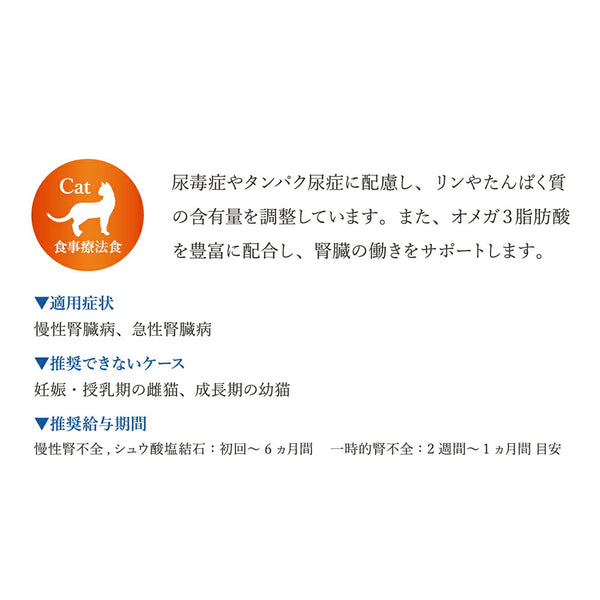 猫用腎臓サポートは慢性腎臓病の猫に給与するために特別に調整された食事療法食です。