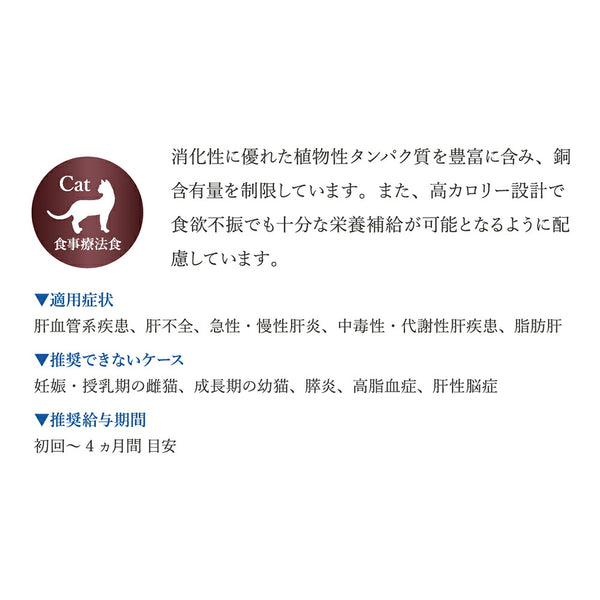 消化性に優れた植物性タンパク質を豊富に含み、銅含有量を制限しています。また、高カロリー設計で食欲不振でも十分な栄養補給が可能となるように配慮しています。