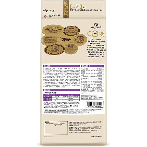 ウェルネスコア子猫用は、猫本来の食性(肉食性)にこだわった、動物性たんぱく質が豊富な穀物不使用のキャットフードです。DHA源のサーモン油を配合し、子猫の健康な脳の発育をサポート。4種類の乳酸菌を配合し、お腹の健康維持をサポート。また、抗酸化栄養素が豊富な野菜や果物を配合し、バランスのとれた栄養で愛猫の健康をサポートします。
