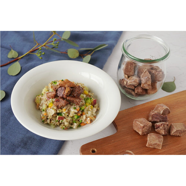 ・お湯で戻すと生肉をボイルしたような香りと食感が楽しめ、嗜好性がさらに高まります。