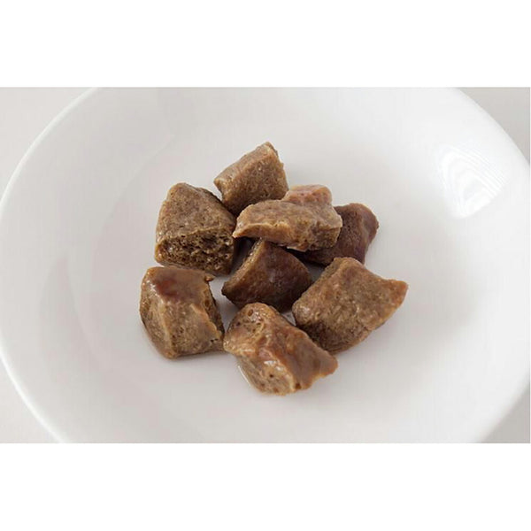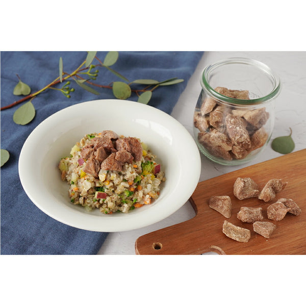・お湯で戻すと生肉をボイルしたような香りと食感が楽しめ、嗜好性がさらに高まります。