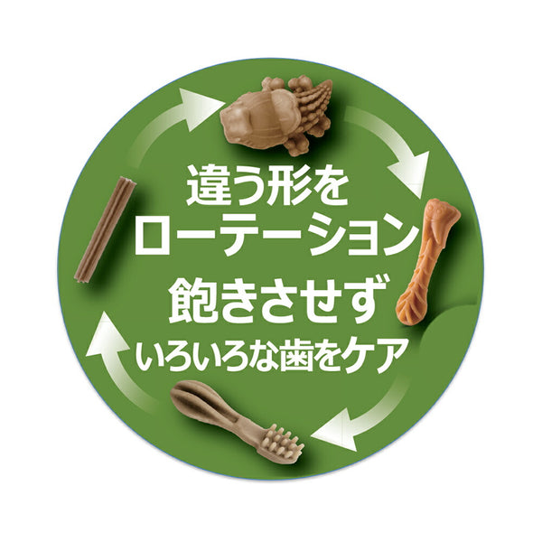 いつも同じ形状のハミガキトリーツを与えると賢いワンちゃんは噛みやすい方の歯だけで噛んでしまい、その他の歯はケアされない場合があります。ウィムズィーズでは、形の違うハミガキトリーツをローテーションで与える事をお薦めしております。